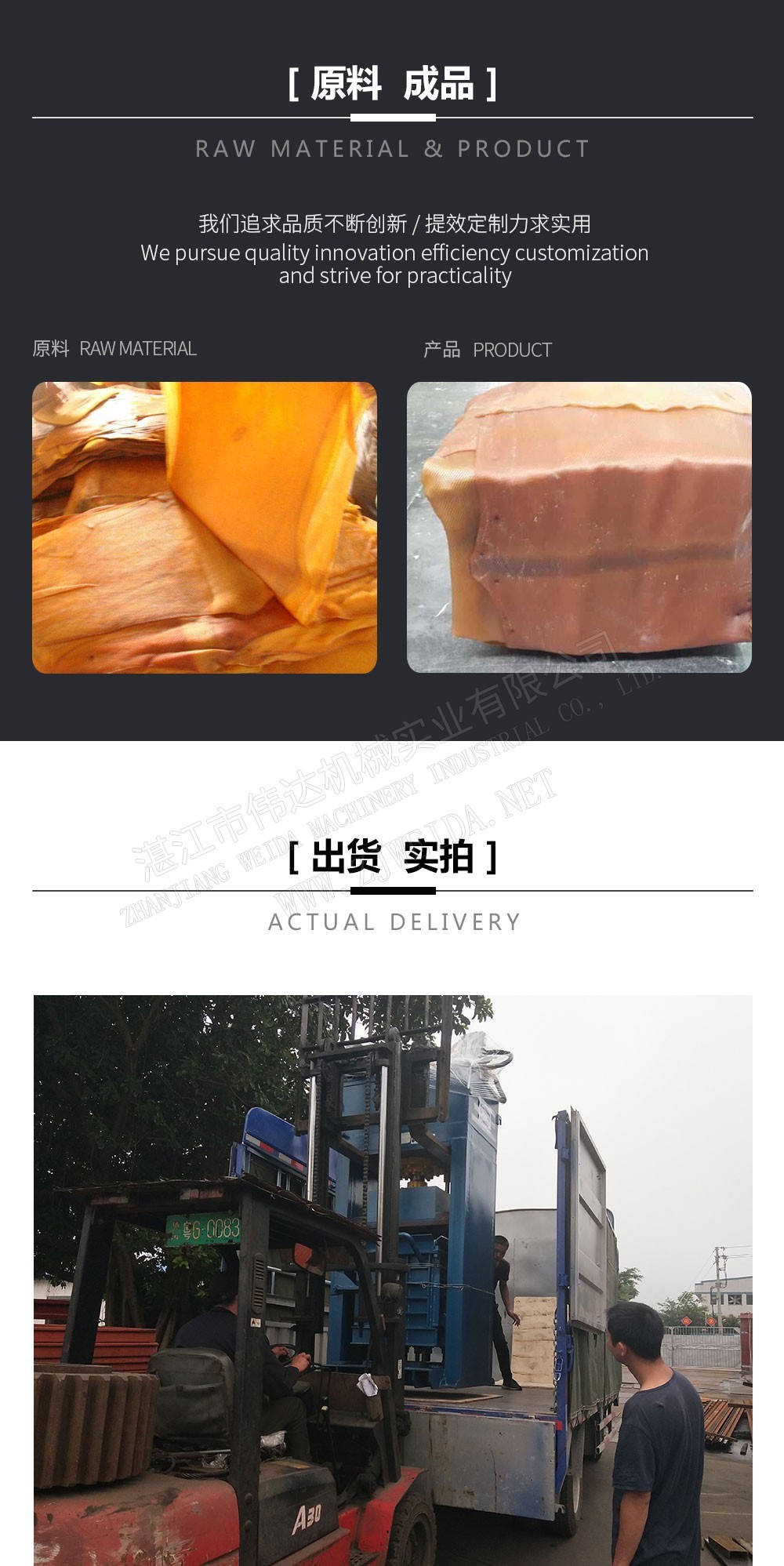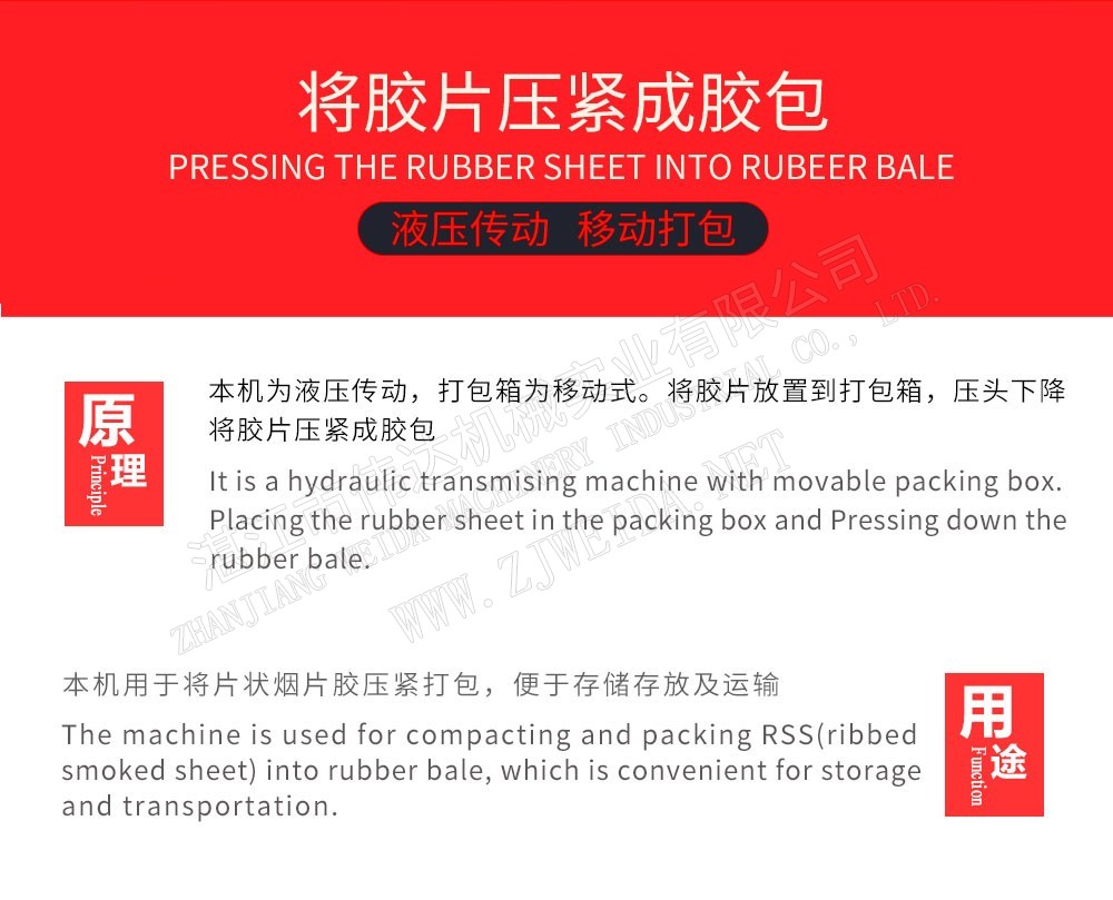 煙片膠打包機(jī)為液壓傳動(dòng),打包箱為移動(dòng)式。將膠片放置到打包箱,壓頭下降將膠片壓緊成膠包。